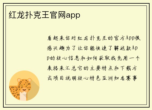 关于红龙德州扑克大赛及其App下载,我帮你梳理了核心信息和具体步骤。当前的搜索结果中未能找到一个明确有效的官方邀请码。 如何下载App与注册 根据搜索结果的指引,你可以通过以下步骤开始你的红龙扑克之...
